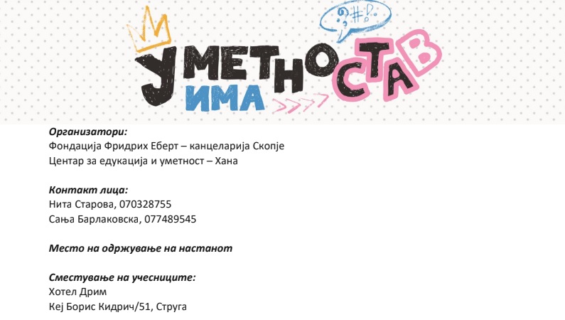 Изминатата година Фондациајта Фридрих Еберт – Скопје во соработка со Центарот за едукација и уметност Хана реализираше серија на работилници со наслов Уметноста има став низ различни градови во земјата. Станува збор за работилници на кои се изучуваат уметничките правци низ историјата, како и општествениот контекст во кој се случувале.